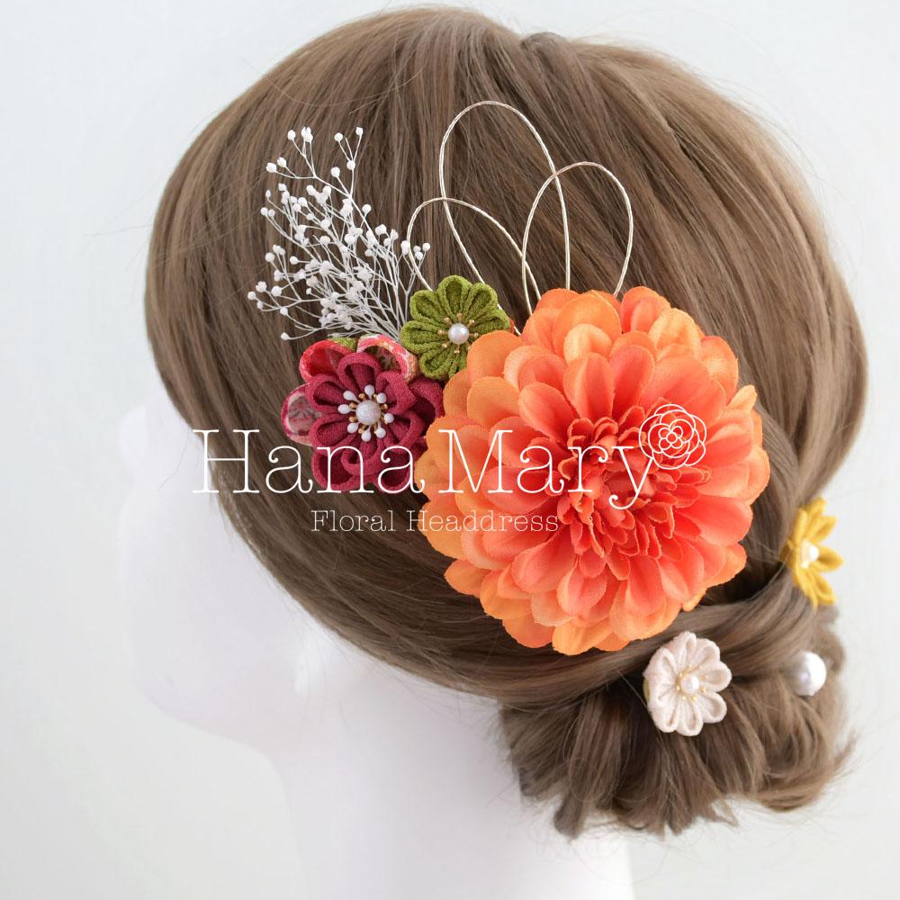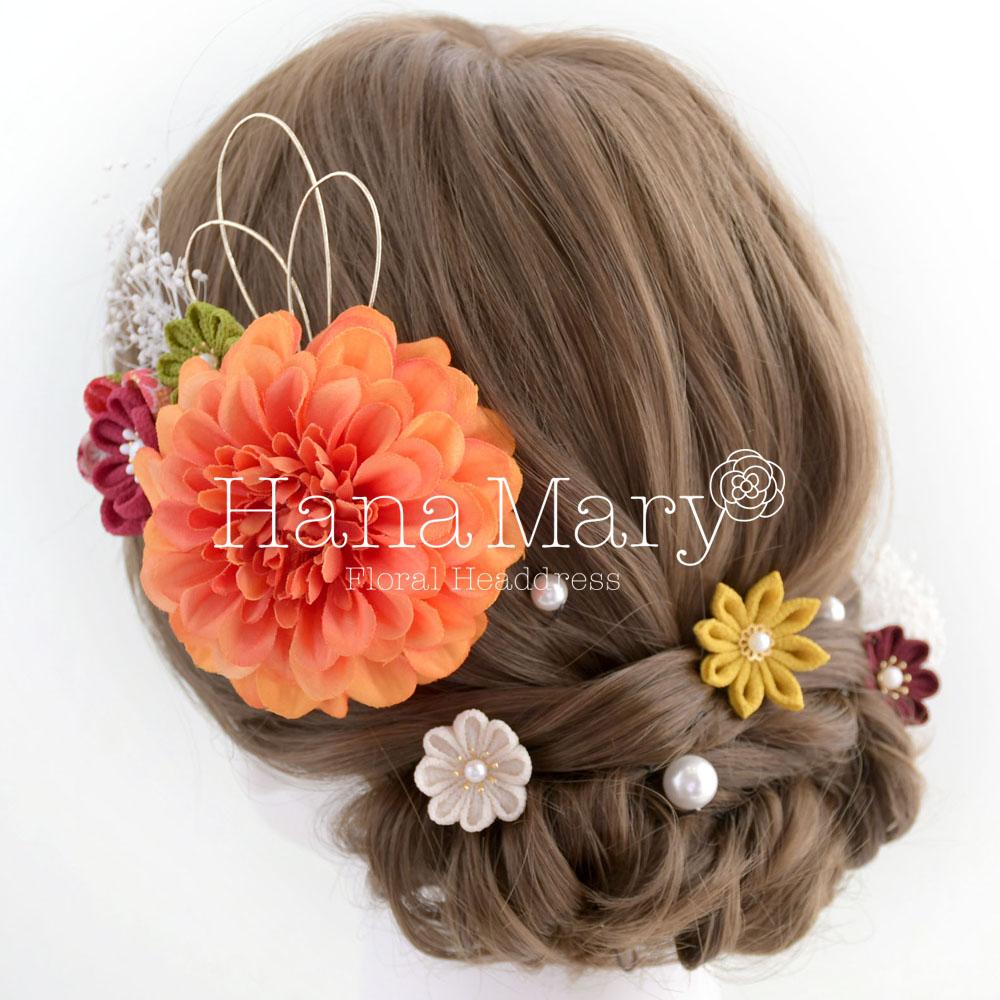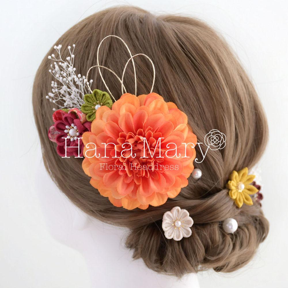 ジニアとつまみ細工の髪飾り【レトロカラー】卒業式 髪飾り 成人式の振袖にも似合う