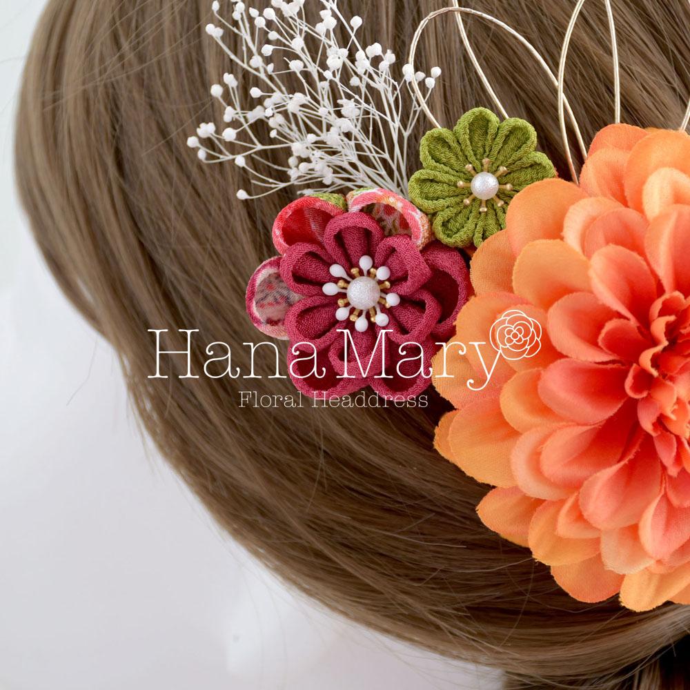 リアルなアーティフィシャルフラワー・ジニアのお花をメインに、色彩豊なつまみ細工を散りばめた髪飾り。