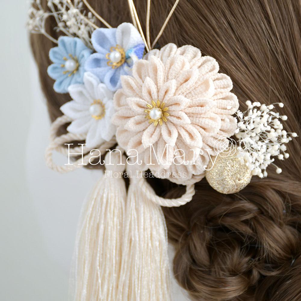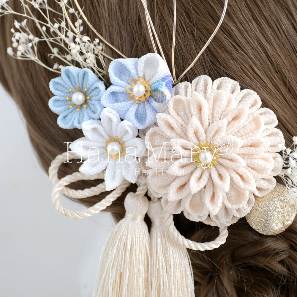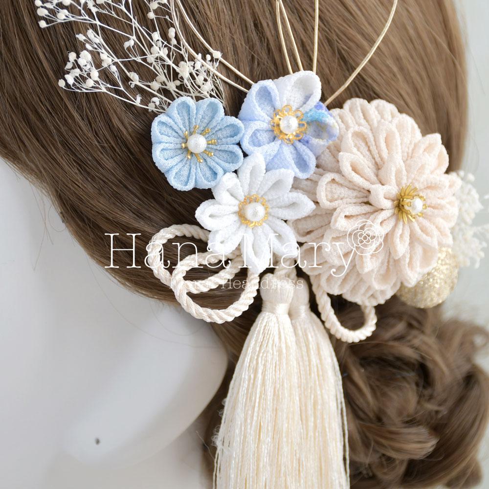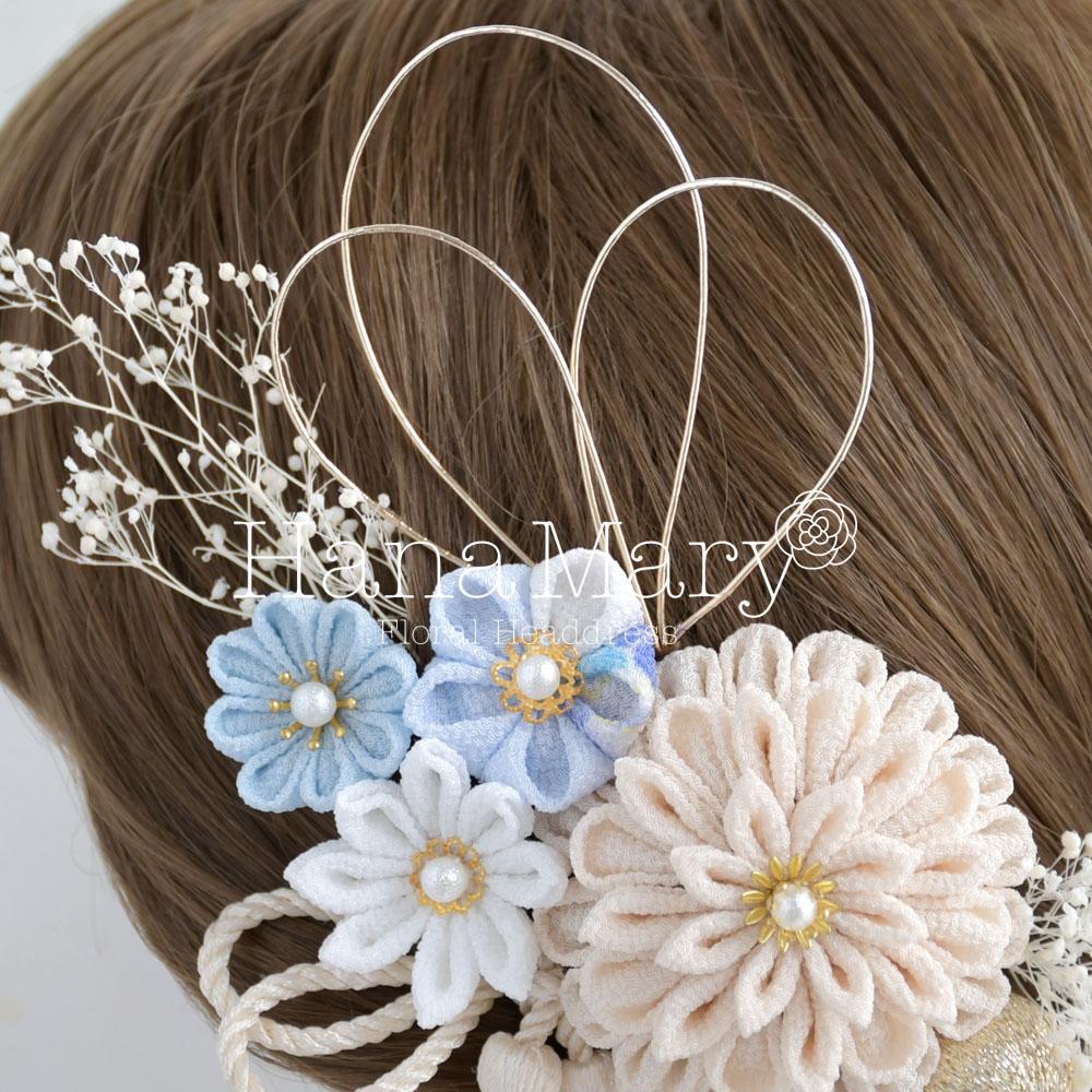 つまみ細工で可愛らしく【淡色青】卒業式 成人式 結婚式 七五三 髪飾り 袴 振袖 着物