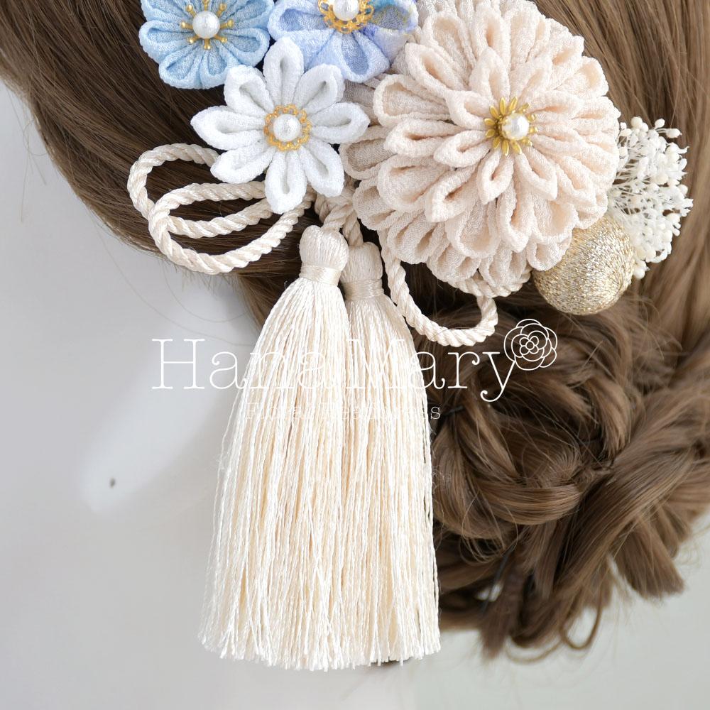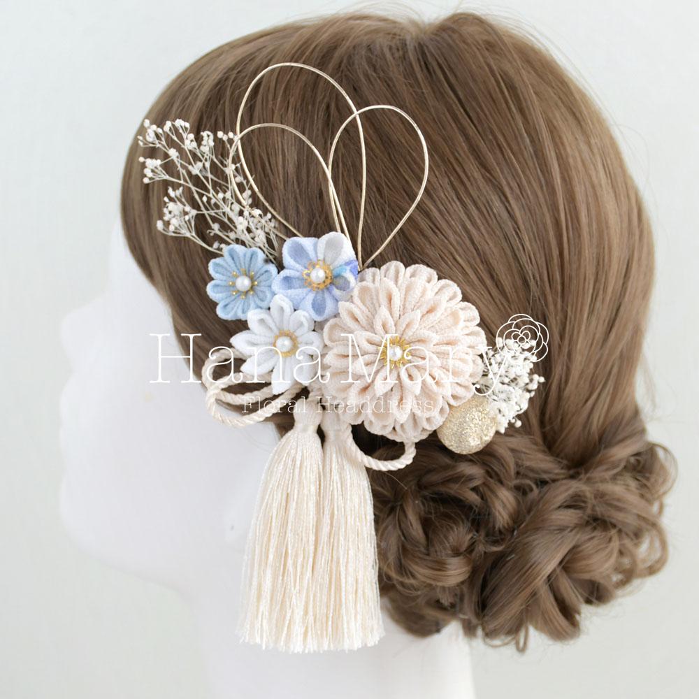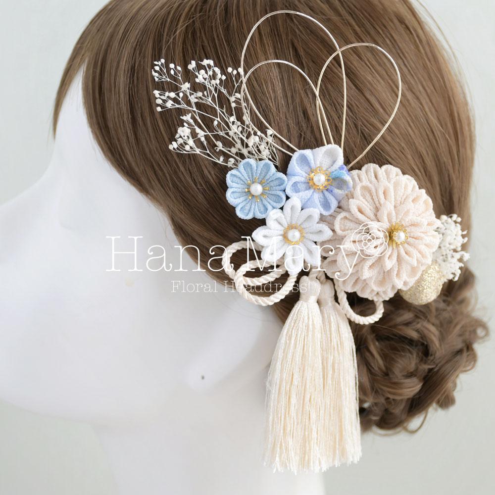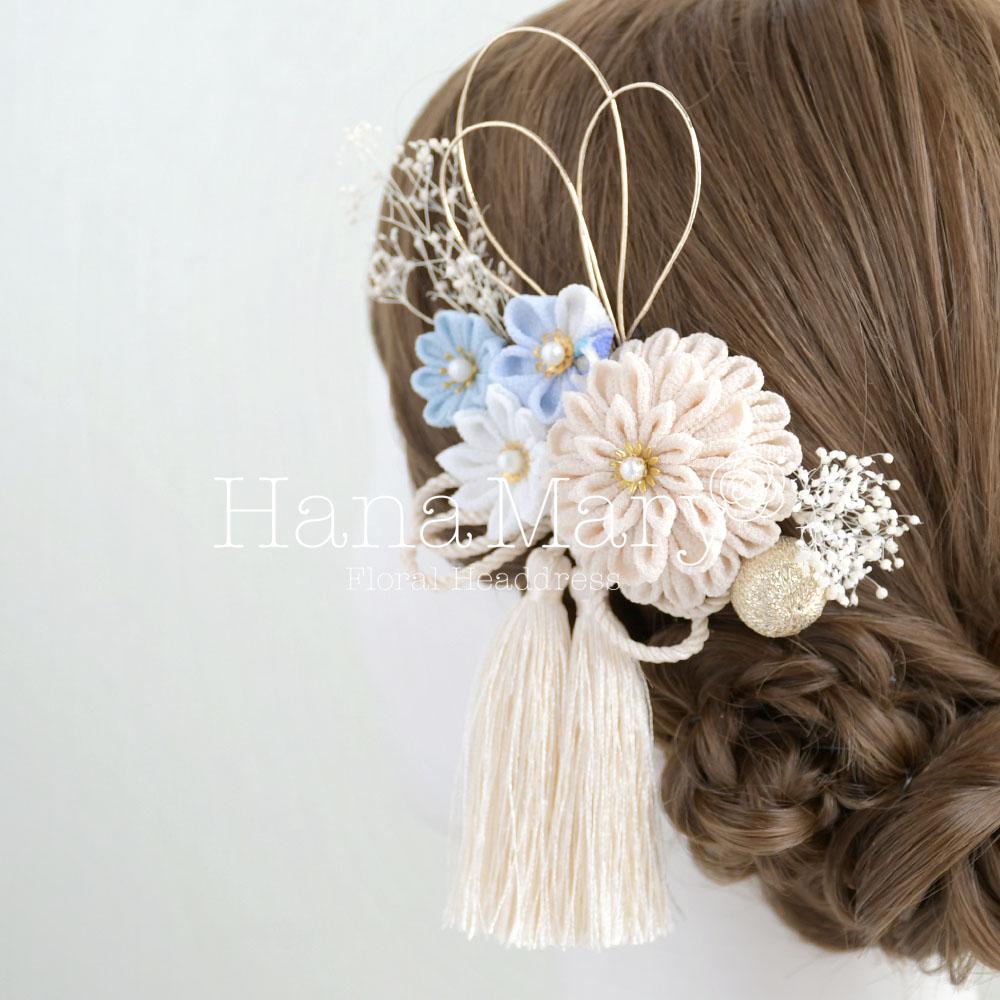 つまみ細工で可愛らしく【淡色青】卒業式 成人式 結婚式 七五三 髪飾り 袴 振袖 着物