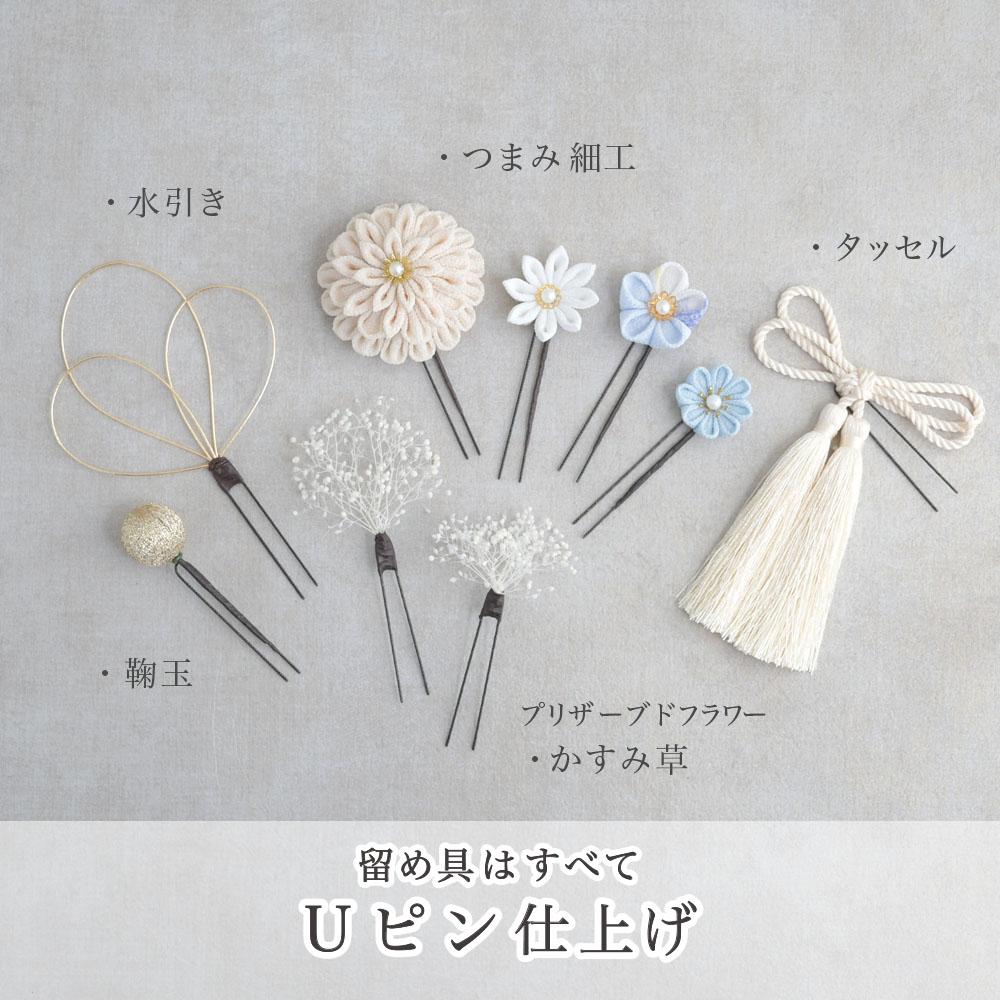 HanaMaryの髪飾りは生花をリアルに再現したアートフラワーと呼ばれるハイクオリティーな造花を使用しています。耐久性に優れ、成人式・卒業式やウェディングなどに何度でも繰り返し使用することができます。