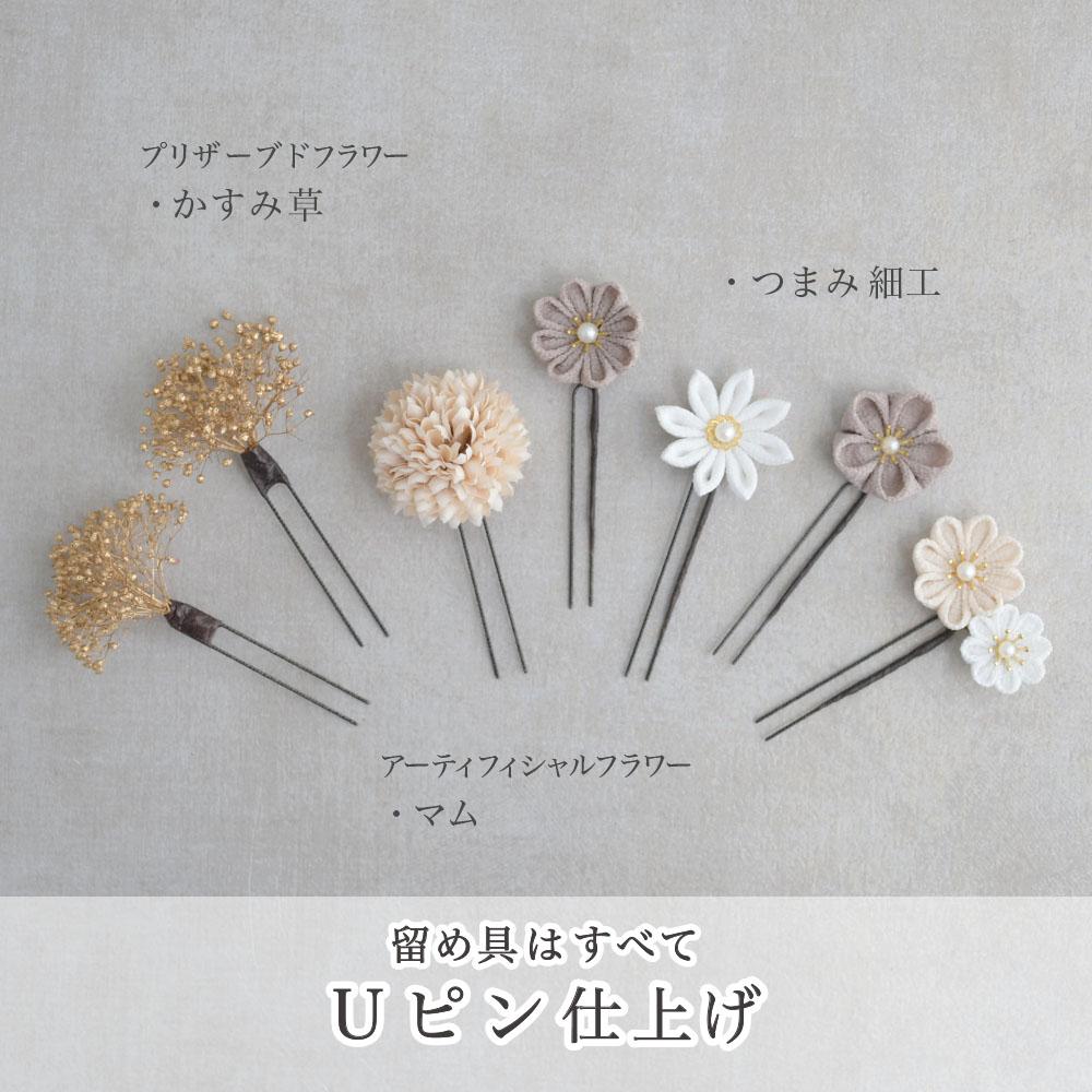 その日のヘアスタイルによって自由に一輪一輪配置できます。お花の数が多い場合でも、アメピンを追加して簡単にしっかりと固定できます。
