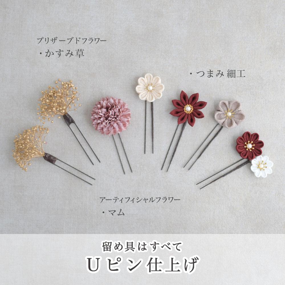 その日のヘアスタイルによって自由に一輪一輪配置できます。お花の数が多い場合でも、アメピンを追加して簡単にしっかりと固定できます。
