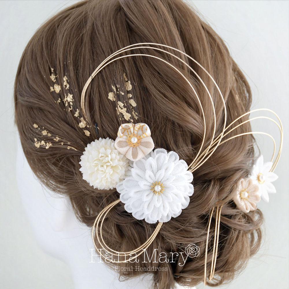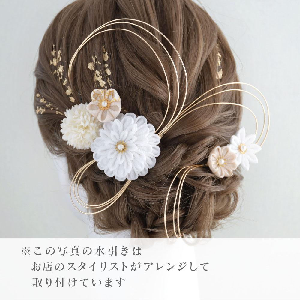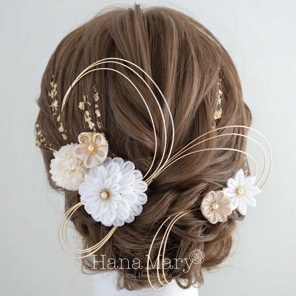 つまみ細工と水引きアレンジ 卒業式 成人式 結婚式【白】振袖 袴 髪飾り
