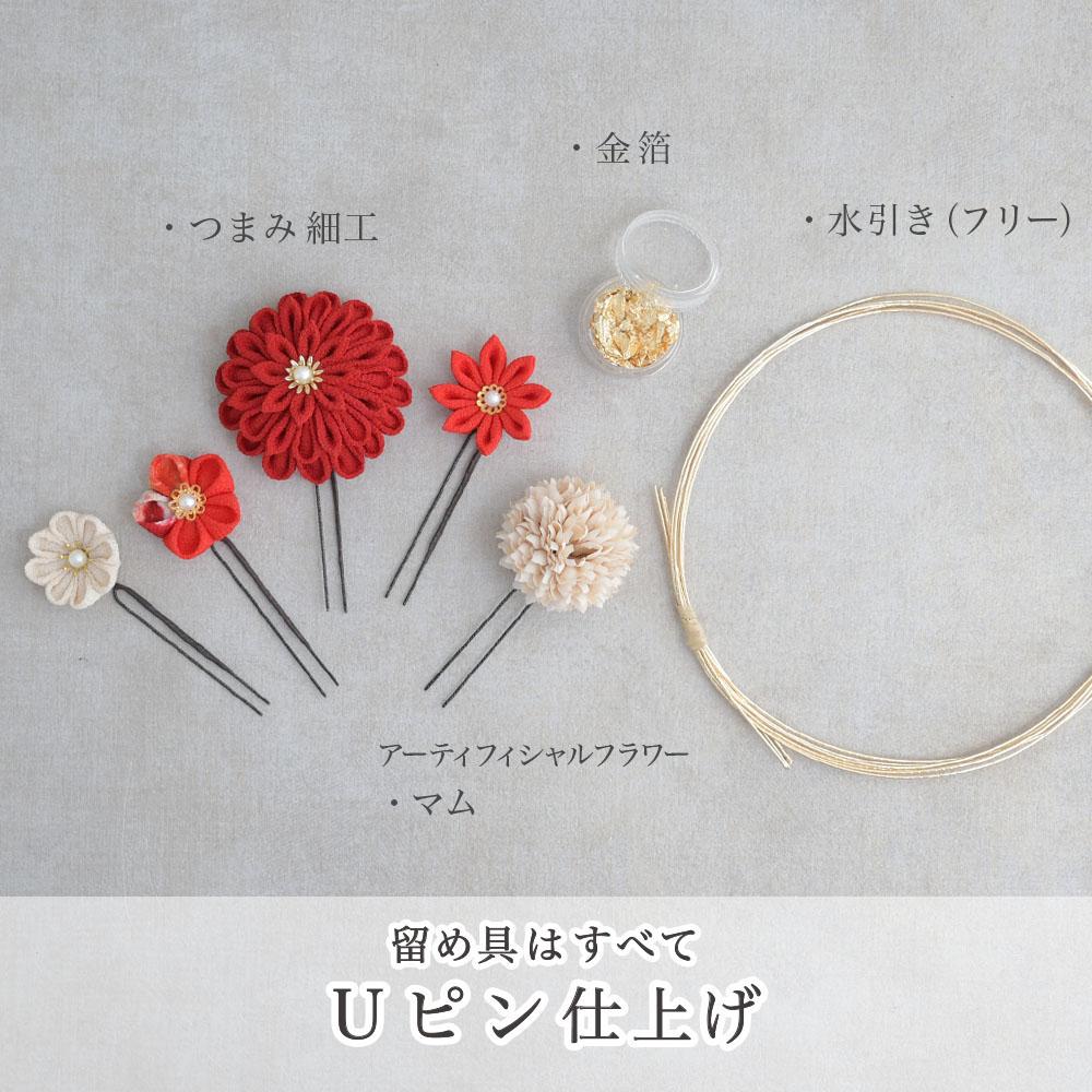 和風な装いやヘアスタイルに華やかに似合うよう金箔と水引きをセットにいたしました。