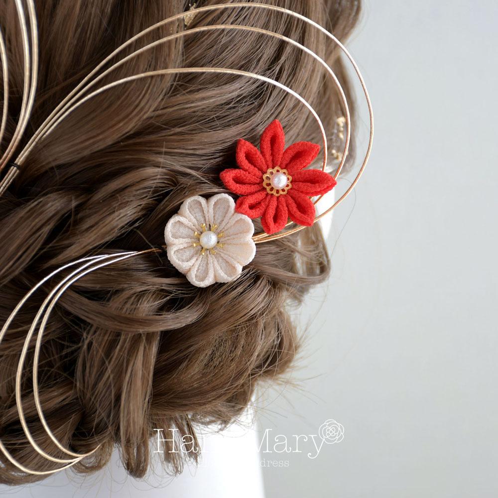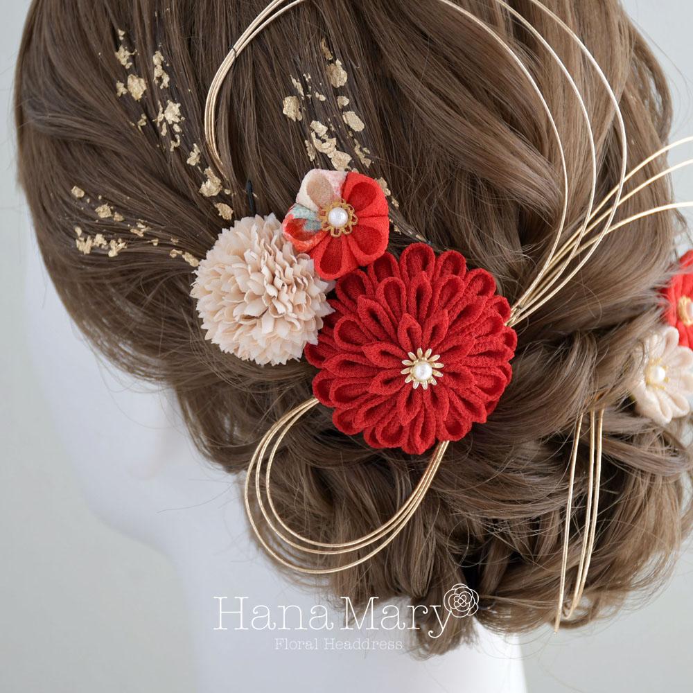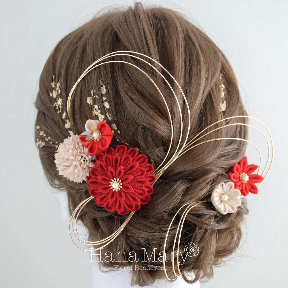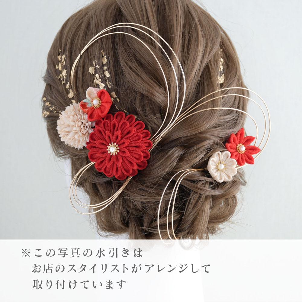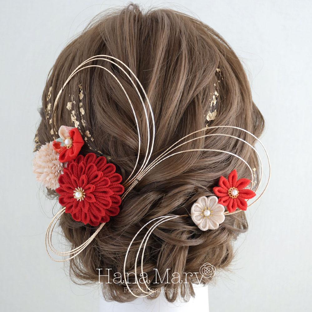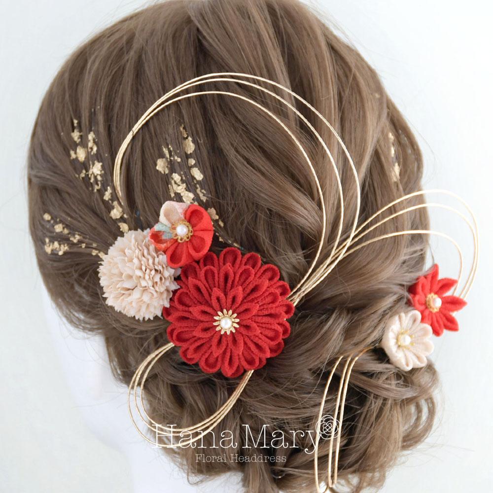 つまみ細工と水引きアレンジ 卒業式 成人式 結婚式【赤】振袖 袴 髪飾り