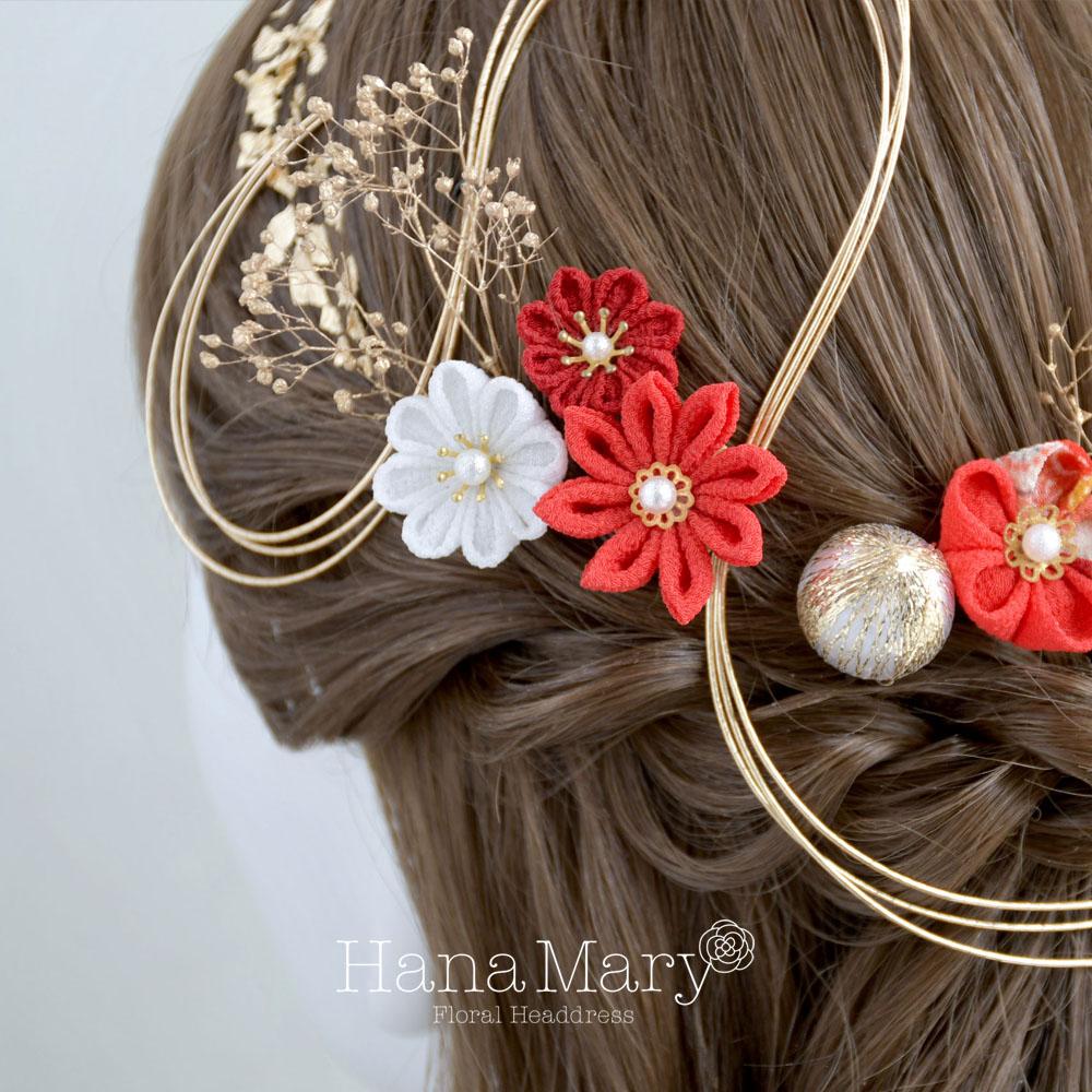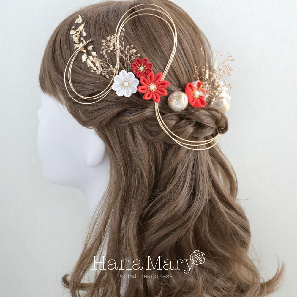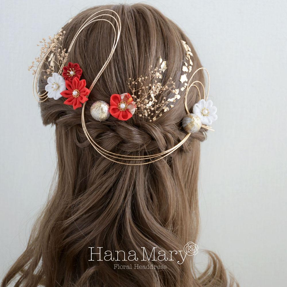 つまみ細工と鞠玉&水引き 髪飾り卒業式 成人式 結婚式【お祝い赤 白】袴 振袖 着物