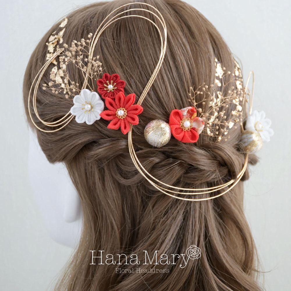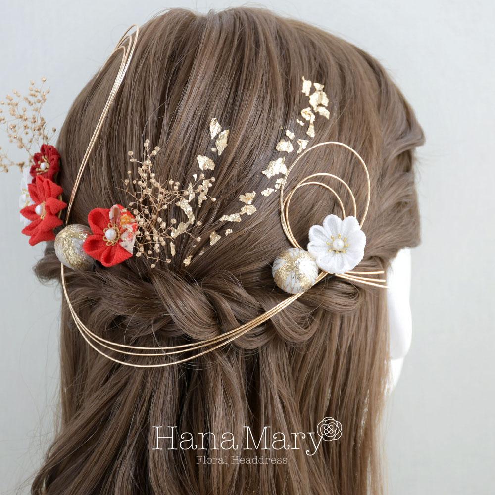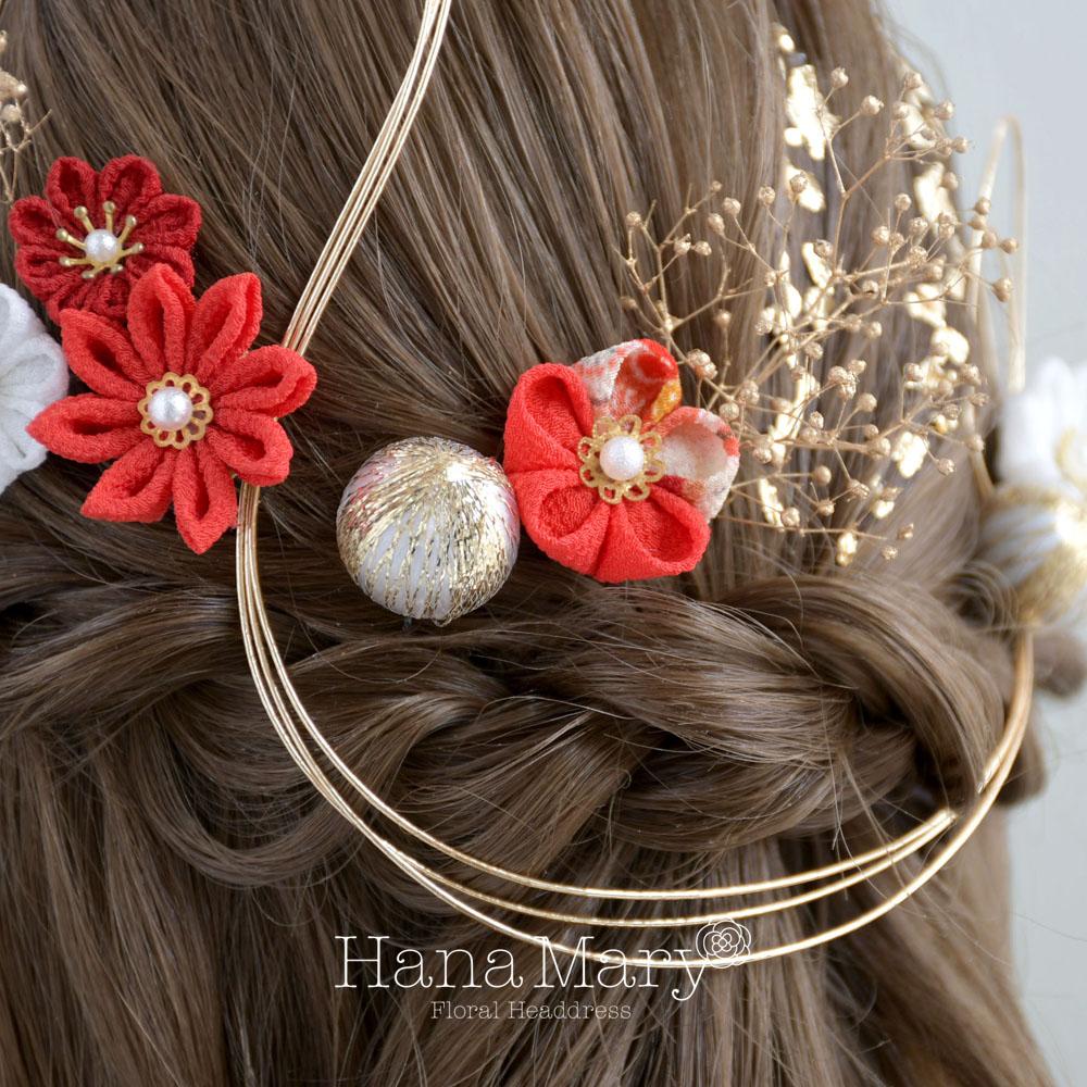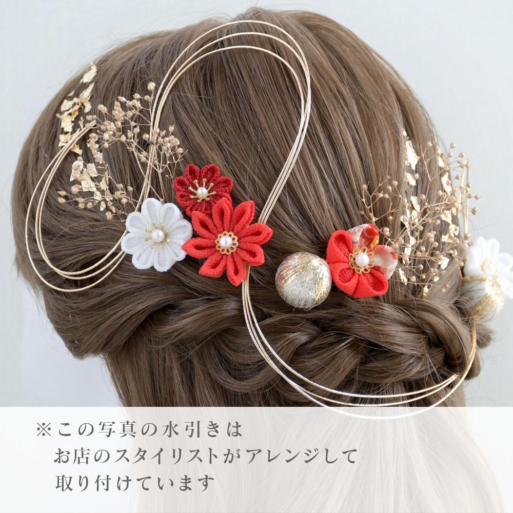 つまみ細工と鞠玉&水引き 髪飾り卒業式 成人式 結婚式【お祝い赤 白】袴 振袖 着物