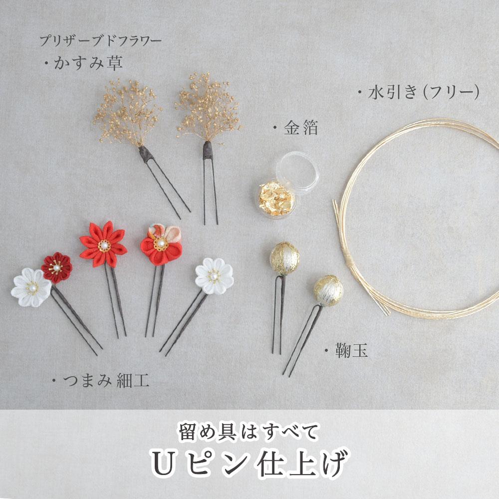 ◉つまみ細工やお花は一輪ずつ独立してUピンに取り付けてあります。