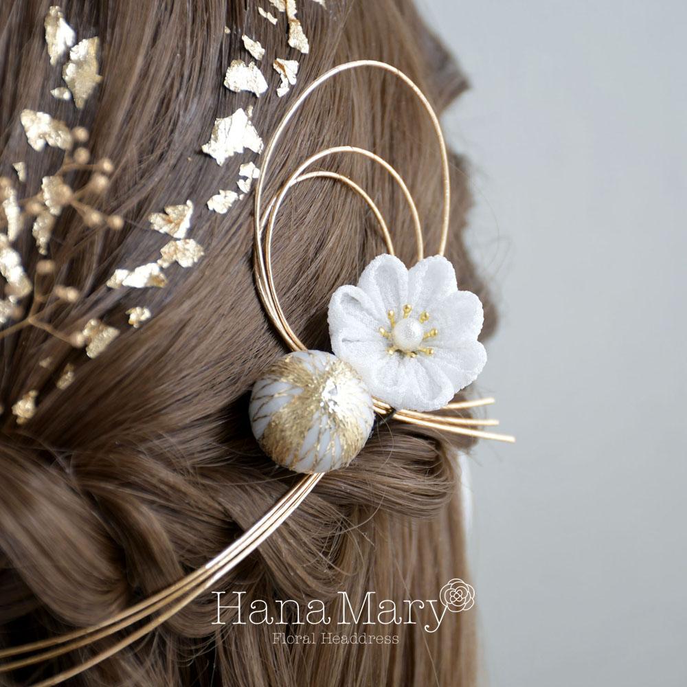 モダンな和装スタイルに人気の鞠玉とかすみ草、水引き+金箔(金箔風に加工)をセットにした髪飾り。