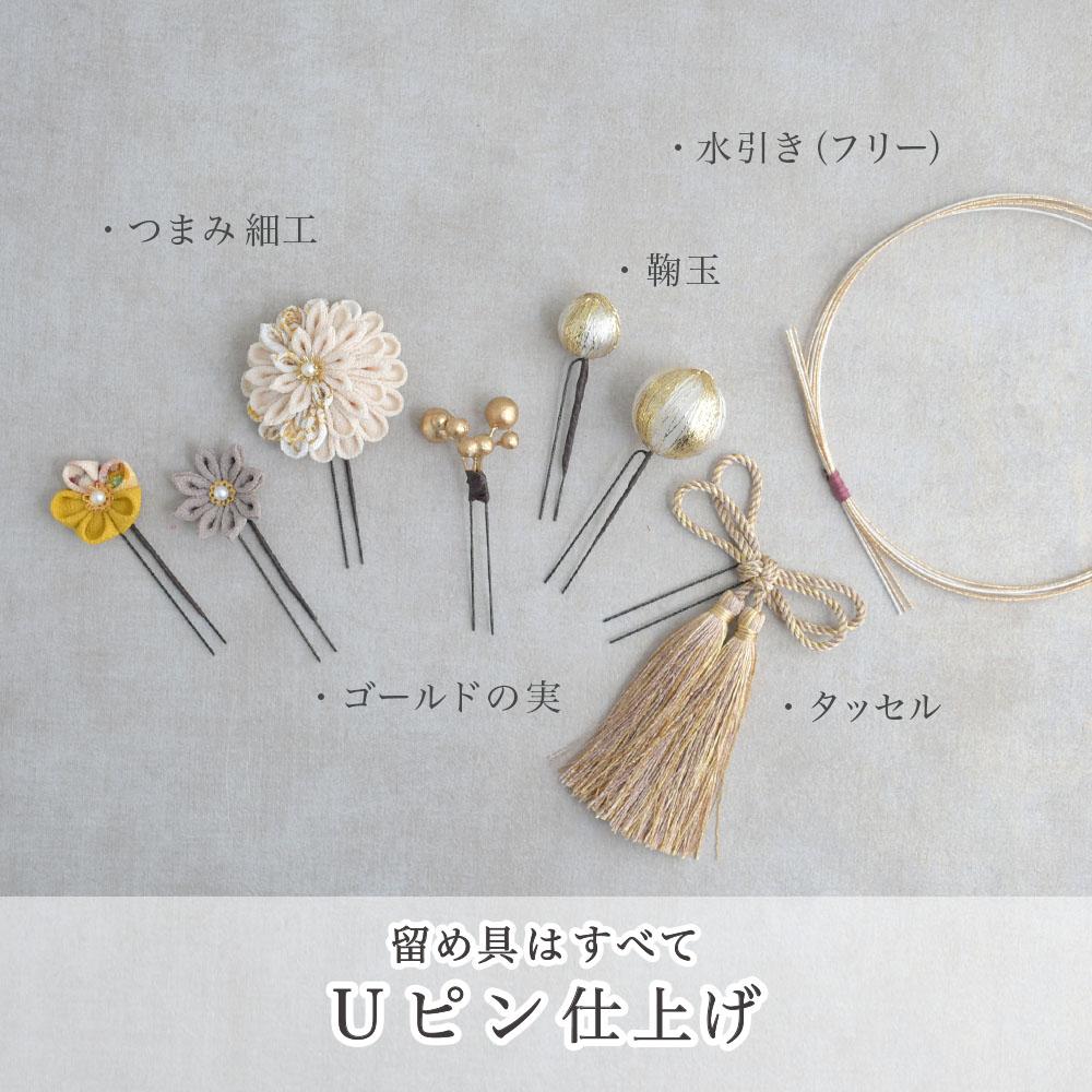 ◉つまみ細工やパーツは全てUピンに、それぞれ独立して取り付けてあります。