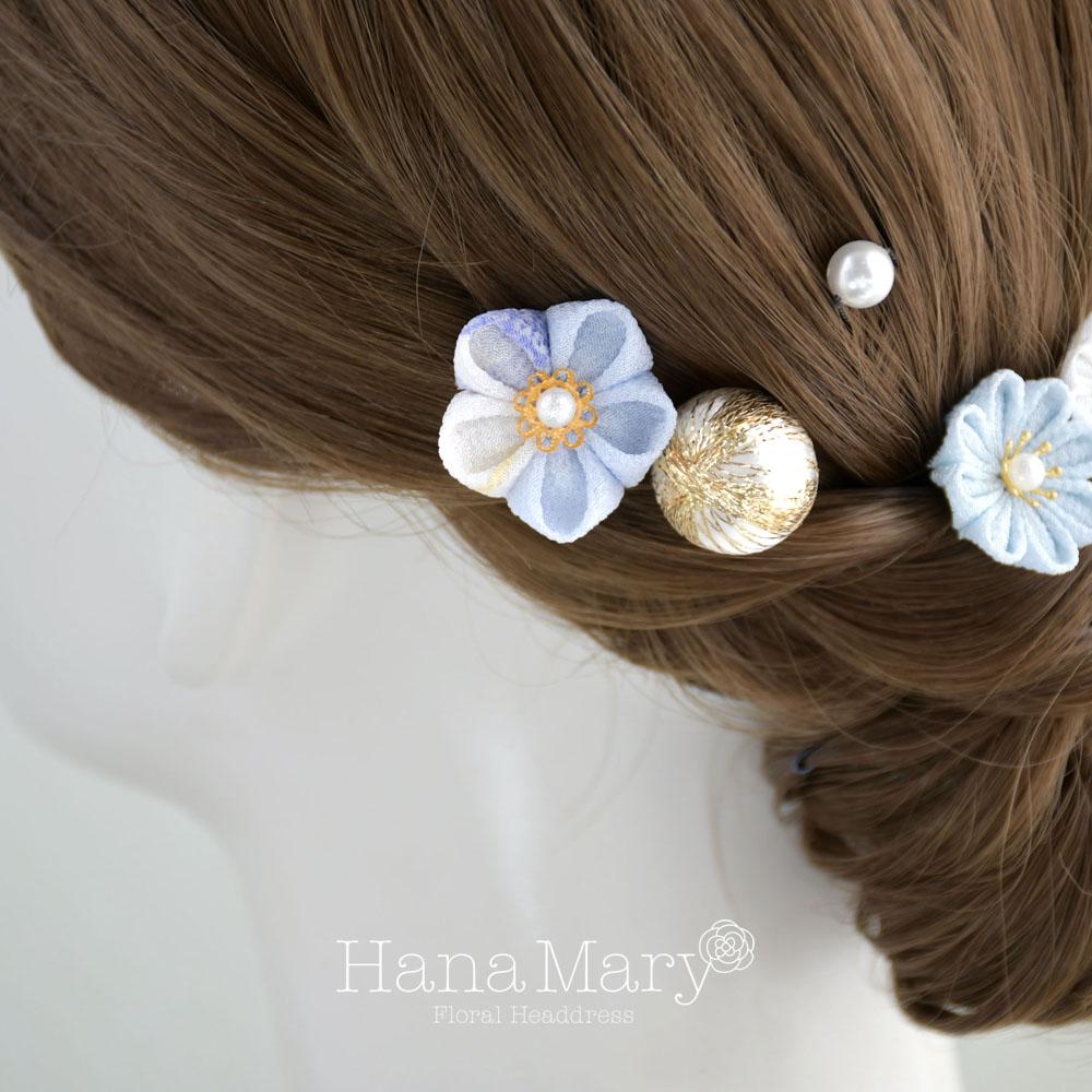 つまみ細工を散らして 卒業式 髪飾り 七五三 成人式 振袖 袴 着物【青色】