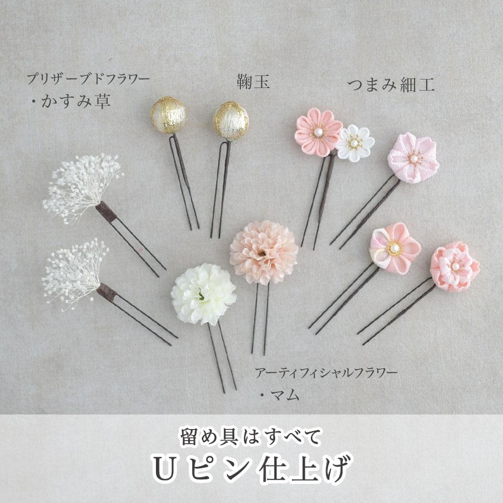 その日のヘアスタイルによって自由に一輪一輪配置できます。お花の数が多い場合でも、アメピンを追加して簡単にしっかりと固定できます。