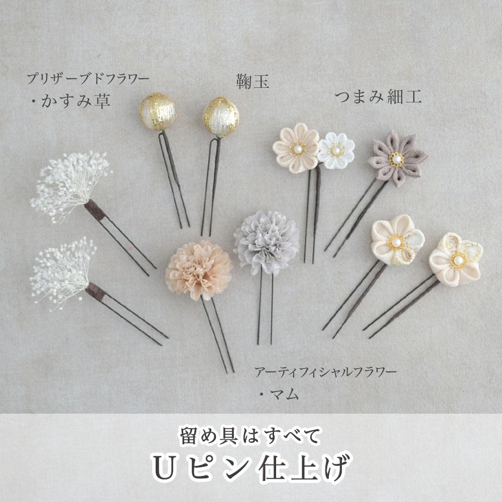 その日のヘアスタイルによって自由に一輪一輪配置できます。お花の数が多い場合でも、アメピンを追加して簡単にしっかりと固定できます。