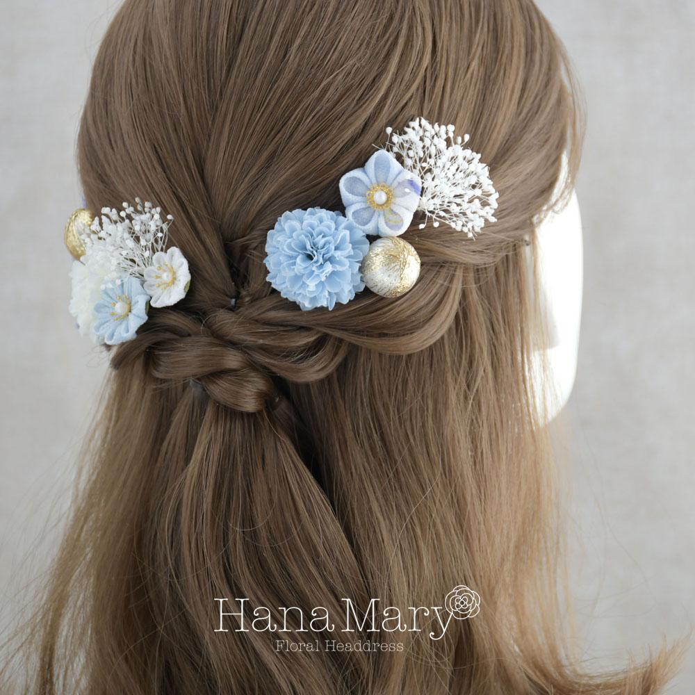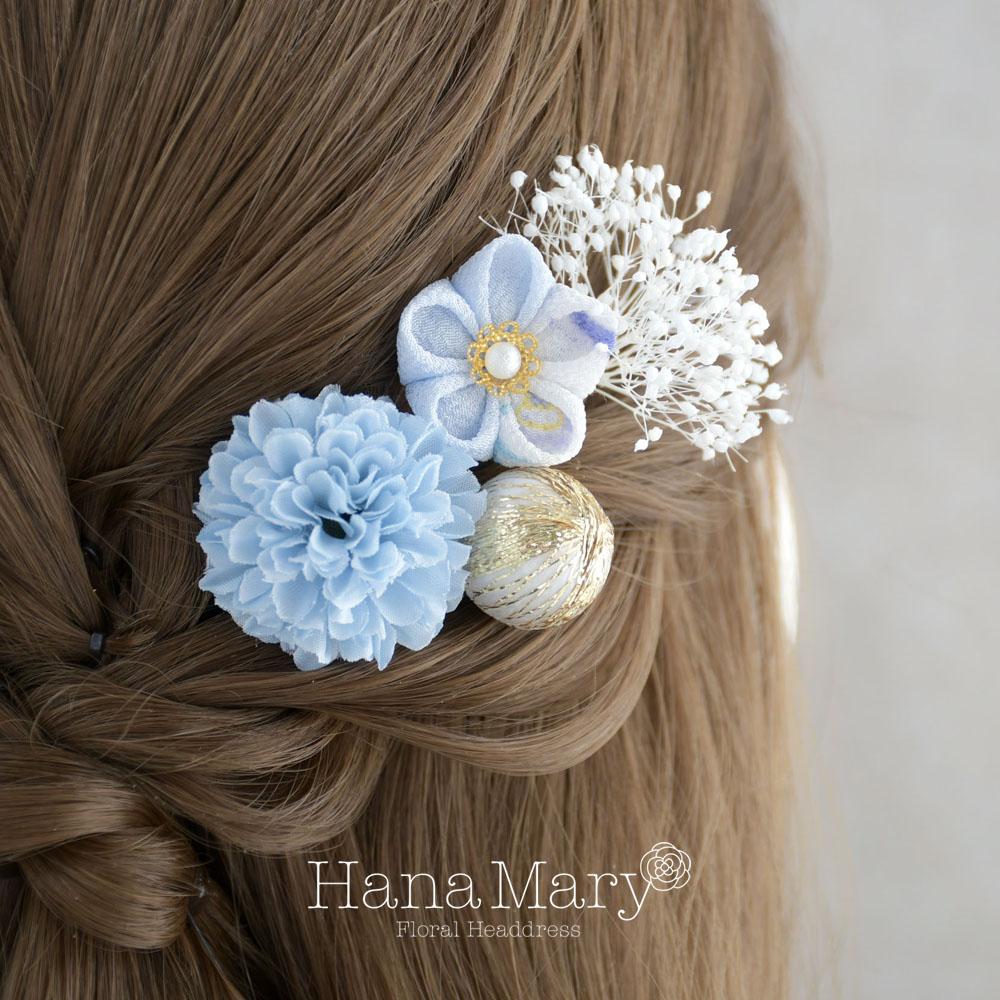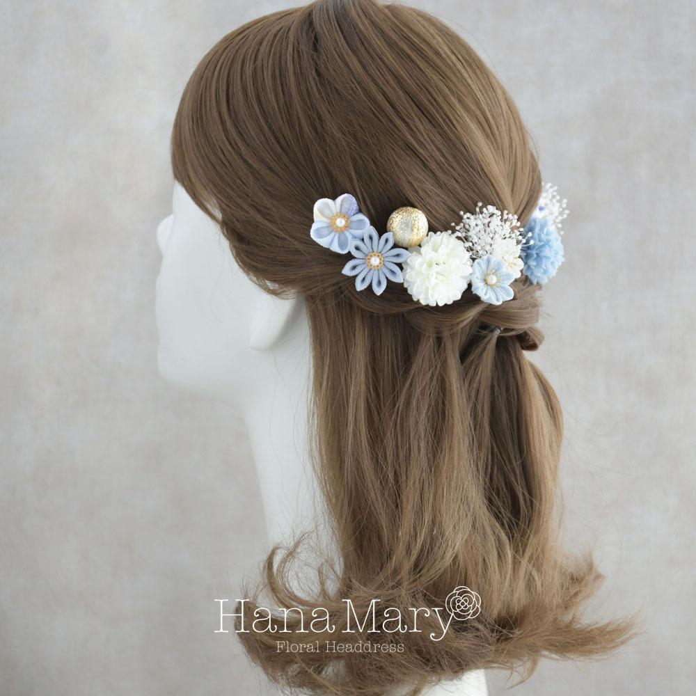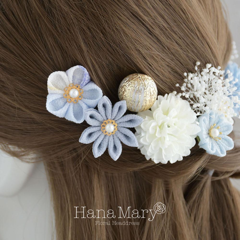 つまみ細工とマムの髪飾り 卒業式 成人式 七五三【ブルー】袴 振袖 着物