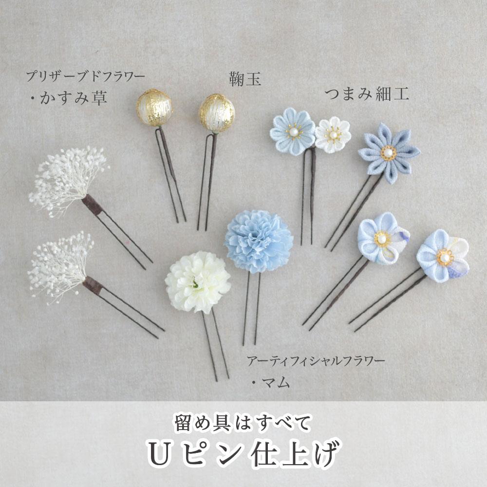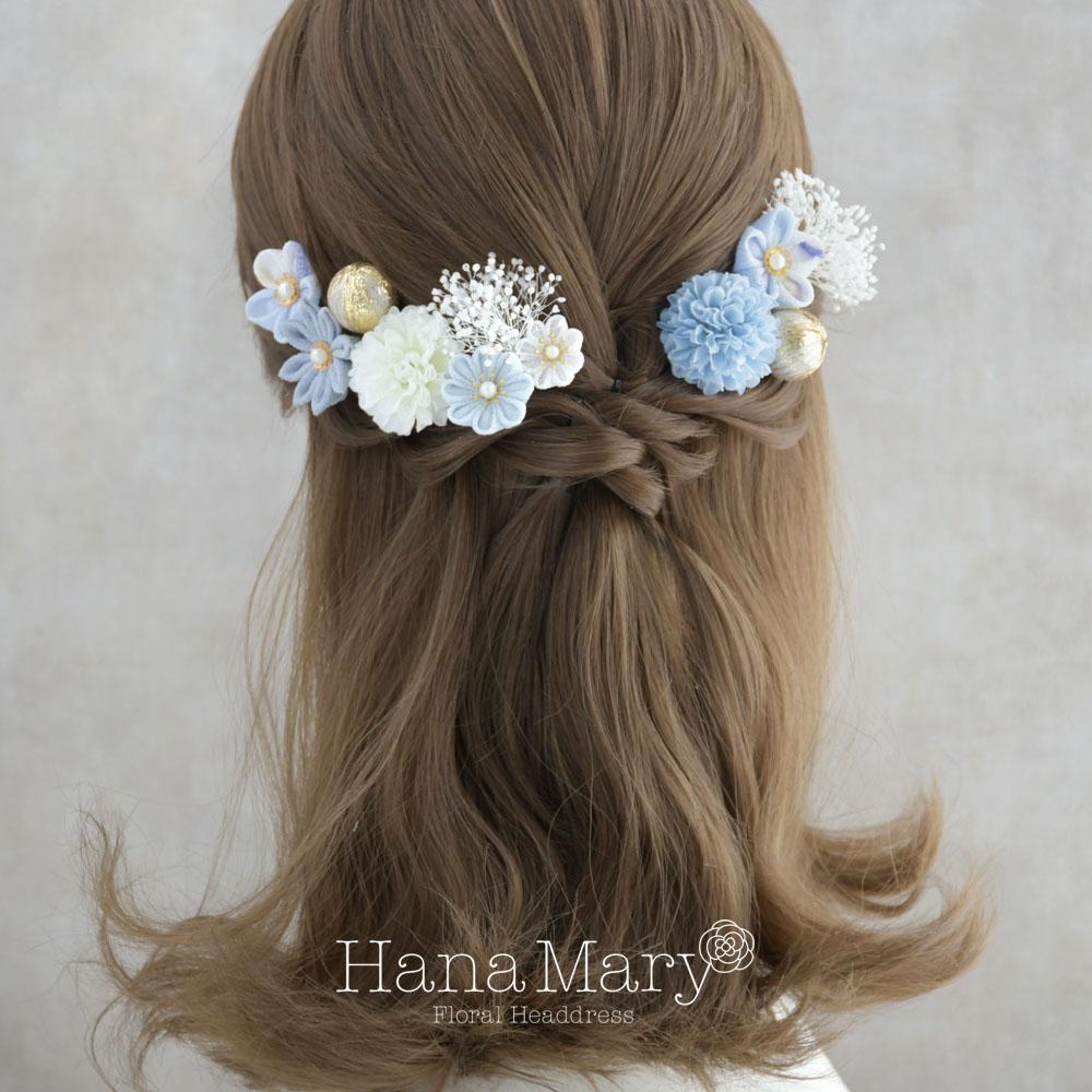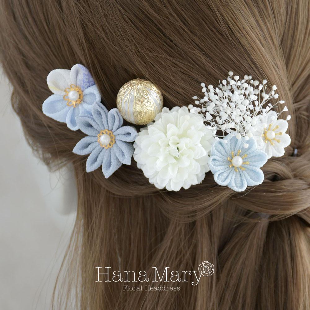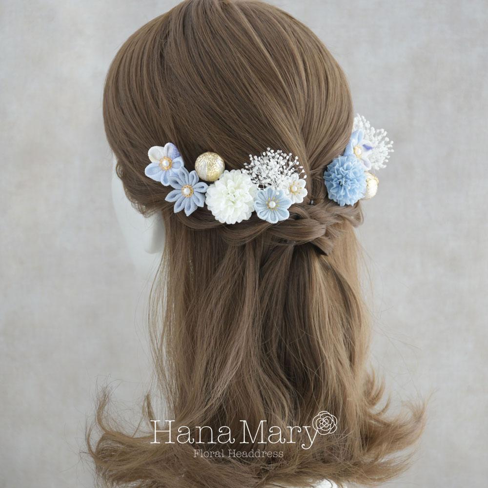 つまみ細工とマムの髪飾り 卒業式 成人式 七五三【ブルー】袴 振袖 着物