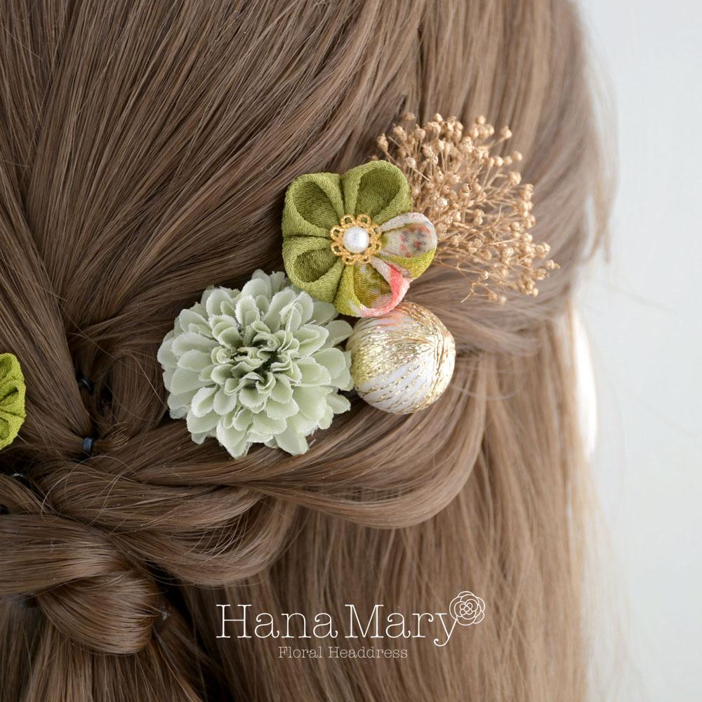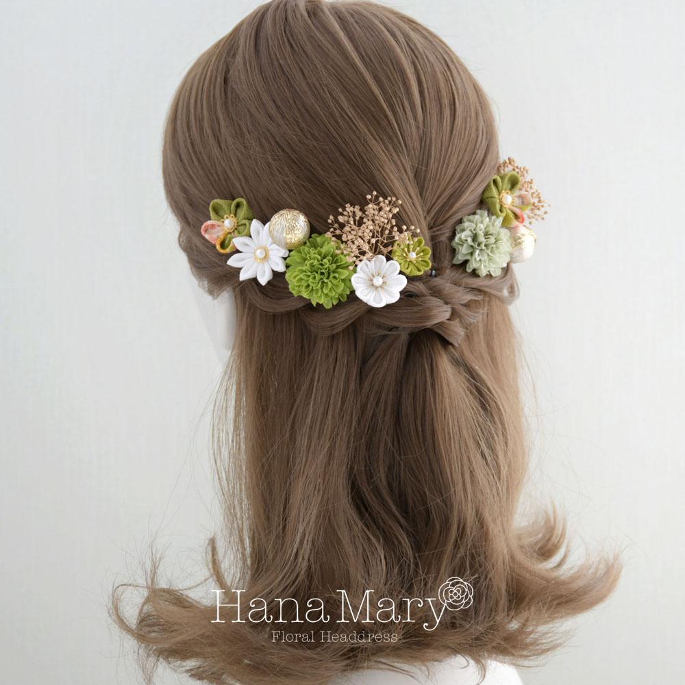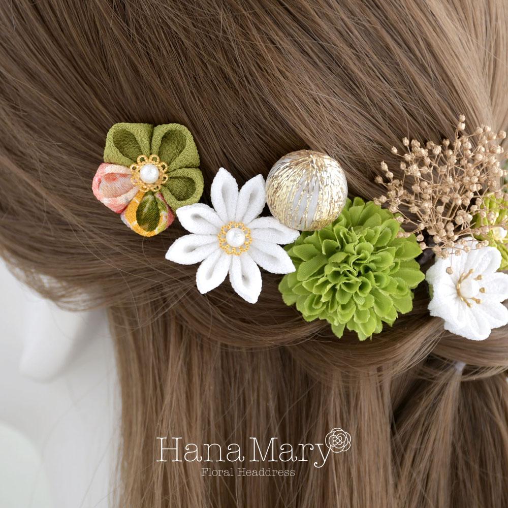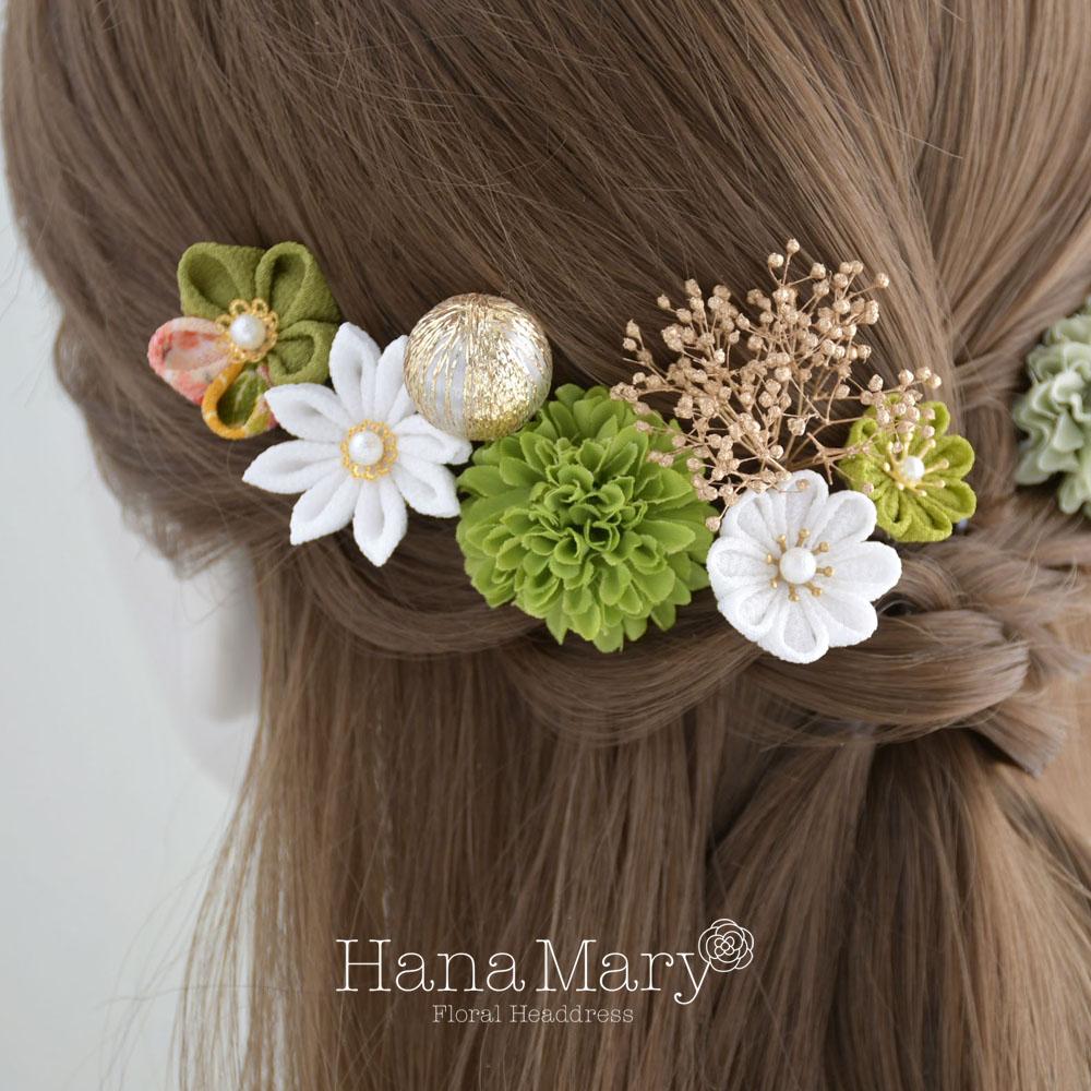 つまみ細工とマムの髪飾り 卒業式 成人式 七五三【グリーン】袴 振袖 着物