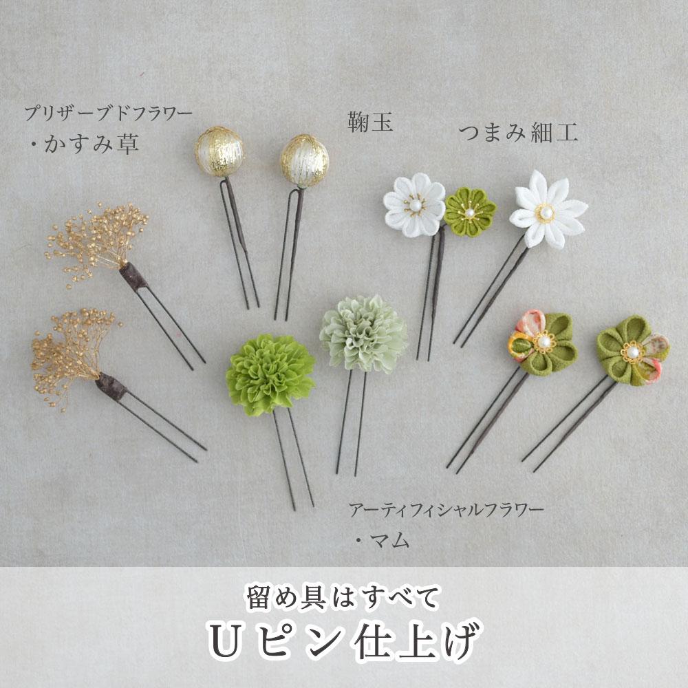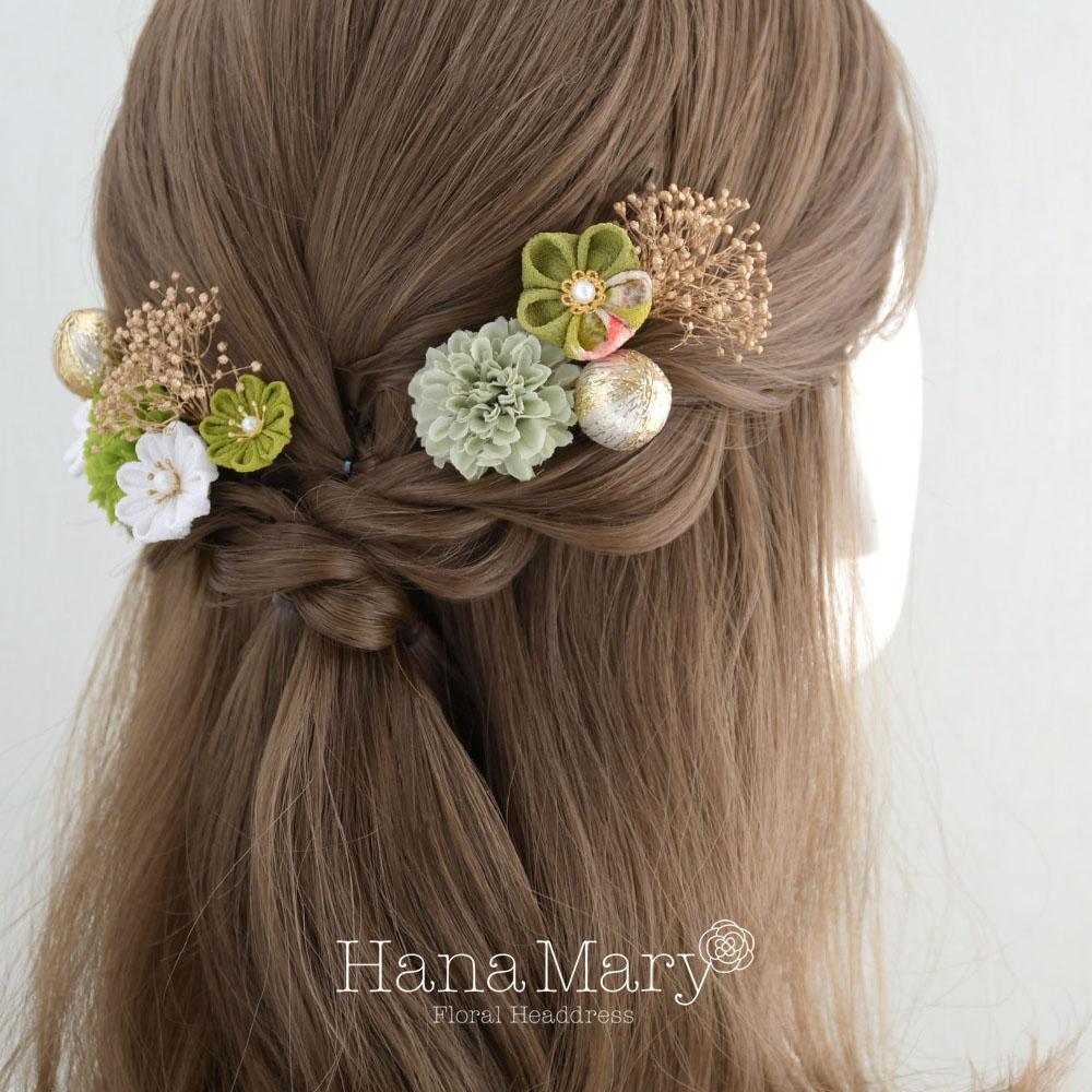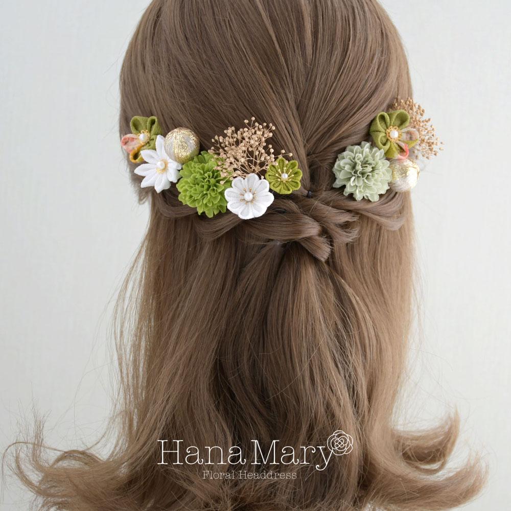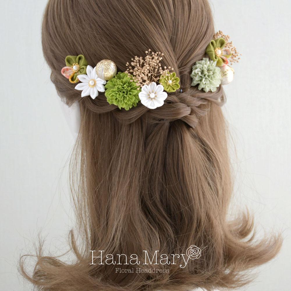つまみ細工とマムの髪飾り 卒業式 成人式 七五三【グリーン】袴 振袖 着物