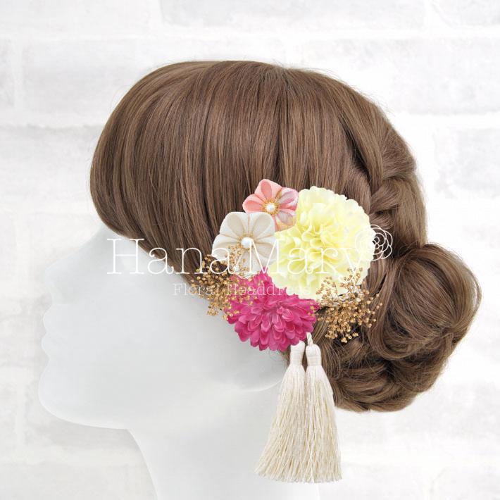 HanaMaryの髪飾りは生花をリアルに再現したアートフラワーと呼ばれるハイクオリティーな造花を使用しています。耐久性に優れ、成人式・卒業式やウェディングなどに何度でも繰り返し使用することができます。