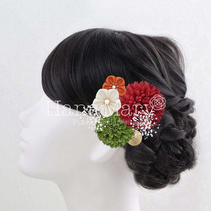 つまみ細工と手毬マム【赤緑】