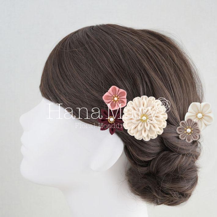 HanaMaryの髪飾りは生花をリアルに再現したアートフラワーと呼ばれるハイクオリティーな造花を使用しています。耐久性に優れ、成人式・卒業式やウェディングなどに何度でも繰り返し使用することができます。