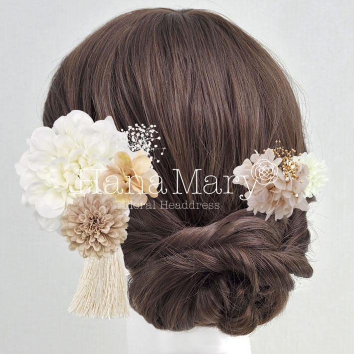 HanaMaryの髪飾りは生花をリアルに再現したアートフラワーと呼ばれるハイクオリティーな造花を使用しています。耐久性に優れ、成人式・卒業式やウェディングなどに何度でも繰り返し使用することができます。