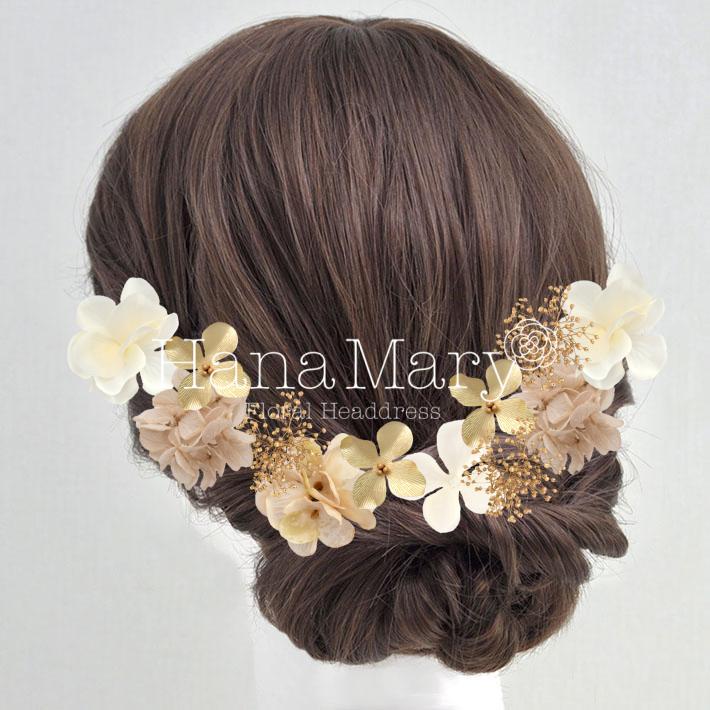 ゴールドベージュのドライフラワー髪飾り