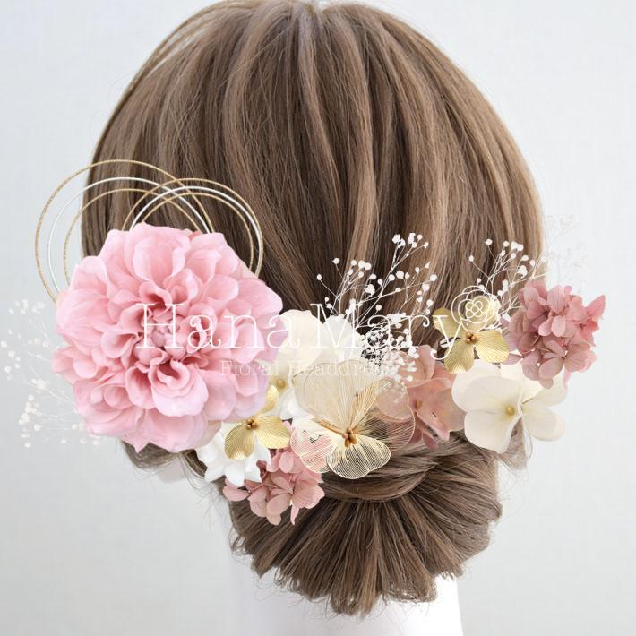 HanaMaryの髪飾りは生花をリアルに再現したアートフラワーと呼ばれるハイクオリティーな造花を使用しています。耐久性に優れ、成人式・卒業式やウェディングなどに何度でも繰り返し使用することができます。