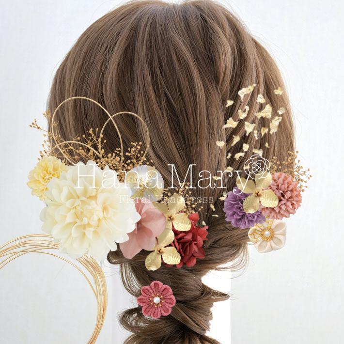 HanaMaryの髪飾りは生花をリアルに再現したアートフラワーと呼ばれるハイクオリティーな造花を使用しています。耐久性に優れ、成人式・卒業式やウェディングなどに何度でも繰り返し使用することができます。