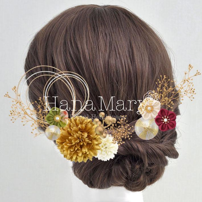 ゴールドのお花と可愛いつまみ細工の髪飾り