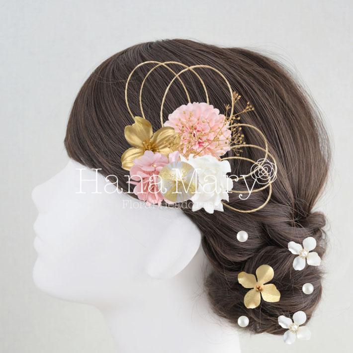 その日のヘアスタイルによって自由に一輪一輪配置できます。お花の数が多い場合でも、アメピンを追加して簡単にしっかりと固定できます。