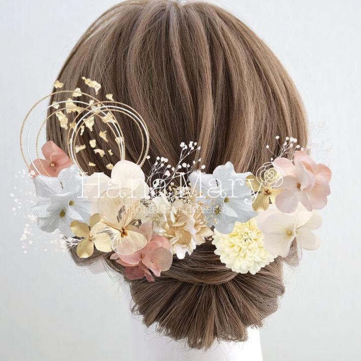 HanaMaryの髪飾りは生花をリアルに再現したアートフラワーと呼ばれるハイクオリティーな造花を使用しています。耐久性に優れ、成人式・卒業式やウェディングなどに何度でも繰り返し使用することができます。