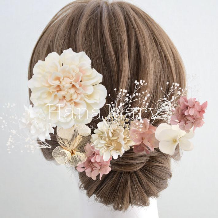 HanaMaryの髪飾りは生花をリアルに再現したアートフラワーと呼ばれるハイクオリティーな造花を使用しています。耐久性に優れ、成人式・卒業式やウェディングなどに何度でも繰り返し使用することができます。