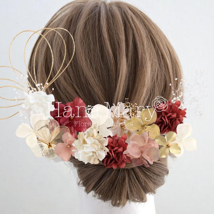 HanaMaryの髪飾りは生花をリアルに再現したアートフラワーと呼ばれるハイクオリティーな造花を使用しています。耐久性に優れ、成人式・卒業式やウェディングなどに何度でも繰り返し使用することができます。