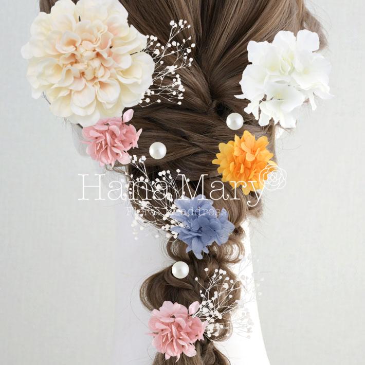 その日のヘアスタイルによって自由に一輪一輪配置できます。お花の数が多い場合でも、アメピンを追加して簡単にしっかりと固定できます。
