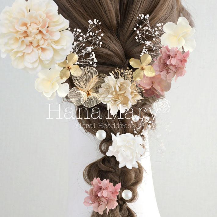 その日のヘアスタイルによって自由に一輪一輪配置できます。お花の数が多い場合でも、アメピンを追加して簡単にしっかりと固定できます。