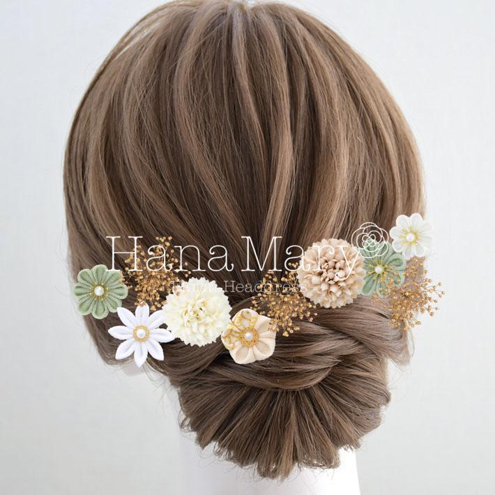 つまみ細工 アッシュグリーン&白